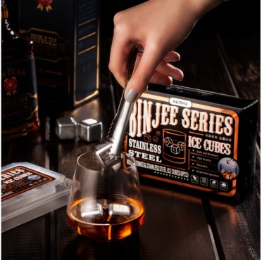 Ohranite okus vaše pijače brez razredčenja z Remax Binjee nerjavečimi jeklenimi ledenimi kockami. Idealne za viski, vino, koktajle ali sok. Kocke so izdelane iz nerjavečega jekla kakovosti 304 in napolnjene s hitro zamrzovalnim gelom. Preprosto jih zamrznite, dodajte v pijačo in uživajte v ohlajenem okusu brez vode. Priložena elegantna škatlica za shranjevanje in klešče za serviranje.
