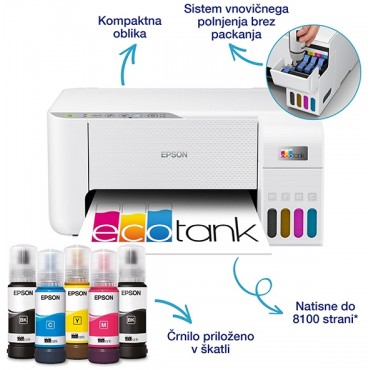 Epson EcoTank L3276 je vsestranski brizgalni večnamenski tiskalnik, zasnovan za domače pisarne, manjša podjetja in uporabnike, ki potrebujejo zanesljivo ter stroškovno učinkovito rešitev za vsakodnevno tiskanje. Sistem rezervoarjev za črnilo omogoča enostavno dolivanje in nižje stroške tiskanja, kar je idealno za okolja z večjim obsegom dokumentov. Naprava združuje tiskanje, skeniranje in kopiranje v eni kompaktni enoti, kar pripomore k boljši organizaciji delovnega prostora.